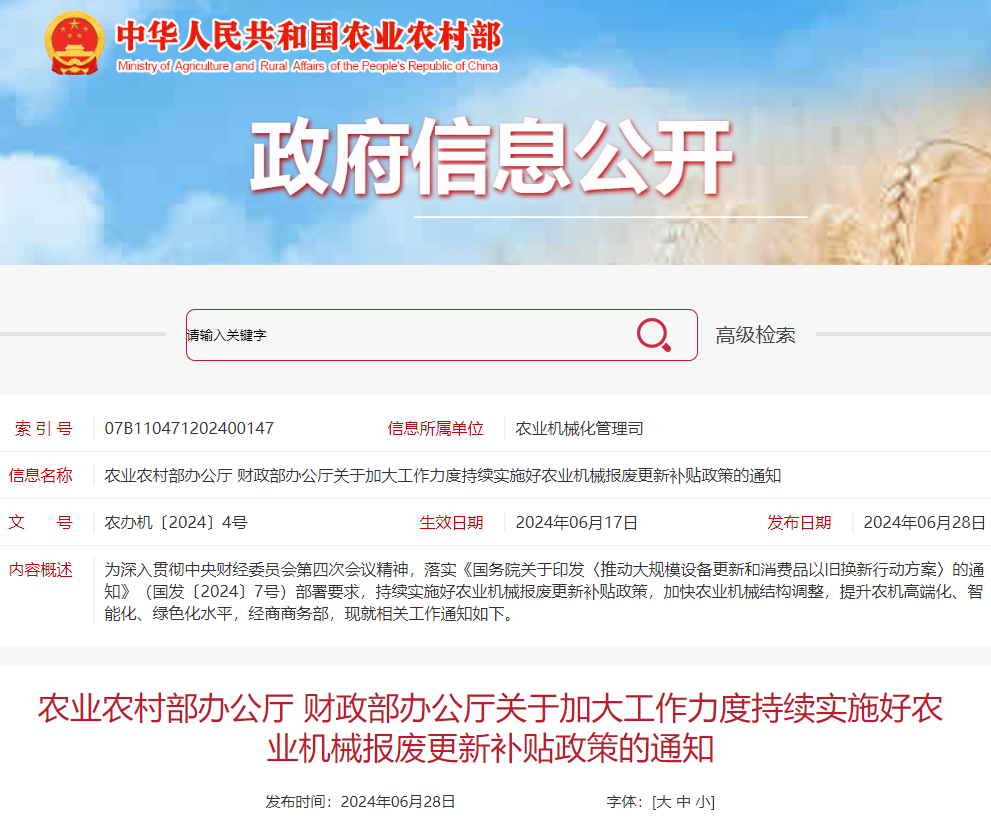 農業(yè)農村部等部門(mén)關(guān)于加大工作力度持續實(shí)施好農業(yè)機械報廢更新補貼政策的通知(最高可領(lǐng)3萬(wàn)元)