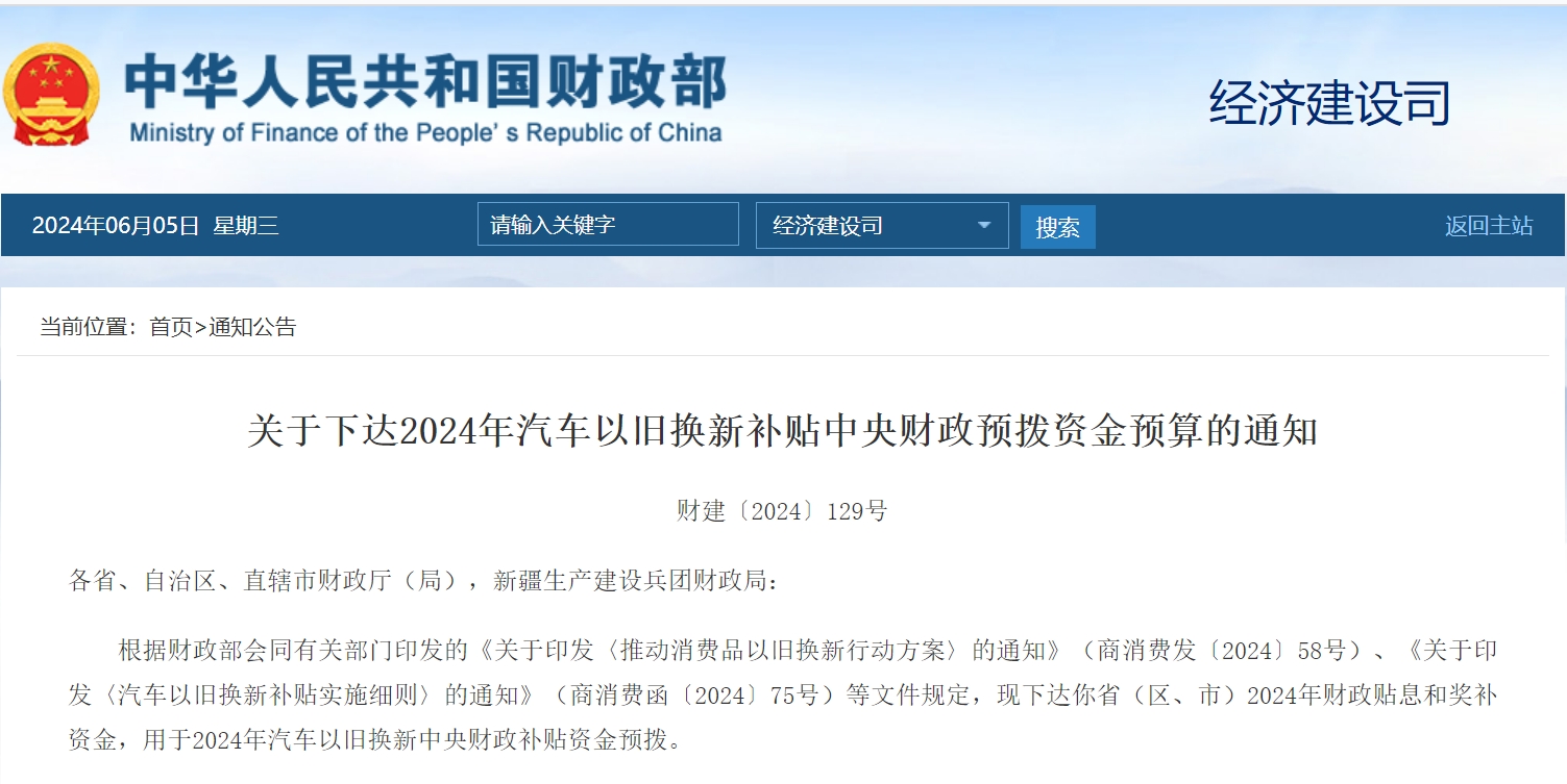 財政部關(guān)于下達2024年汽車(chē)以舊換新補貼******財政預撥資金預算的通知