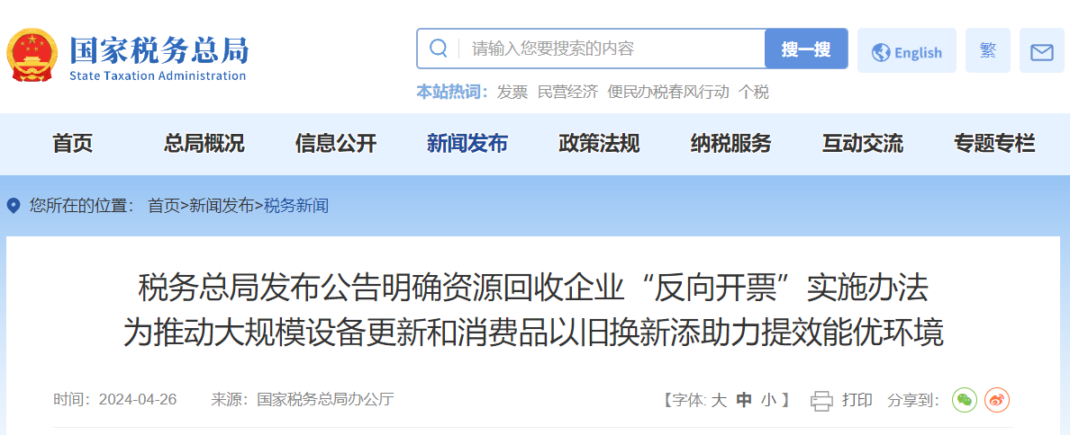 稅務(wù)總局發(fā)布公告明確資源回收企業(yè)“反向開(kāi)票”實(shí)施辦法