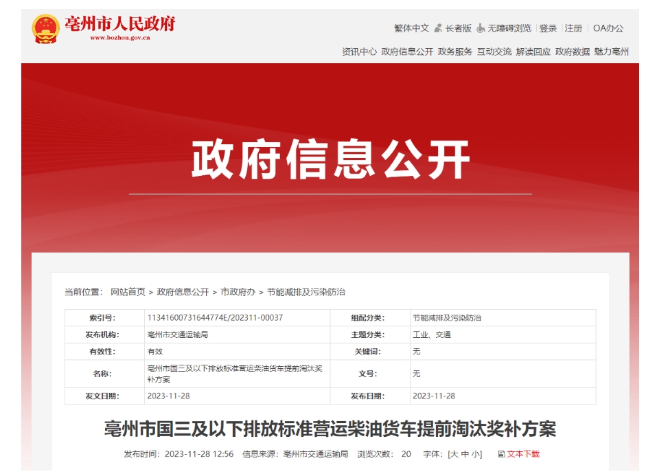 安徽省亳州市國三及以下排放標準營(yíng)運柴油貨車(chē)提前淘汰獎補方案
