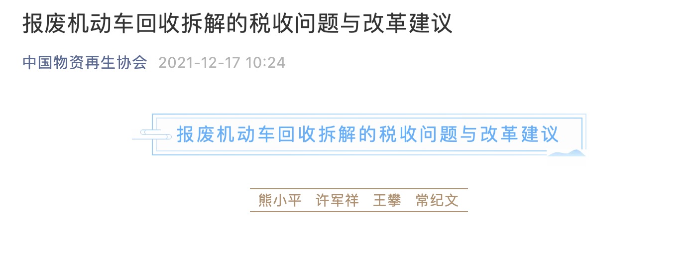 為解決報廢機動(dòng)車(chē)拆解行業(yè)稅收問(wèn)題,玉成有限公司董事長(cháng)王攀先生攜手行業(yè)大咖,共同提出《報廢機動(dòng)車(chē)回收拆解的稅收問(wèn)題與改革建議》。