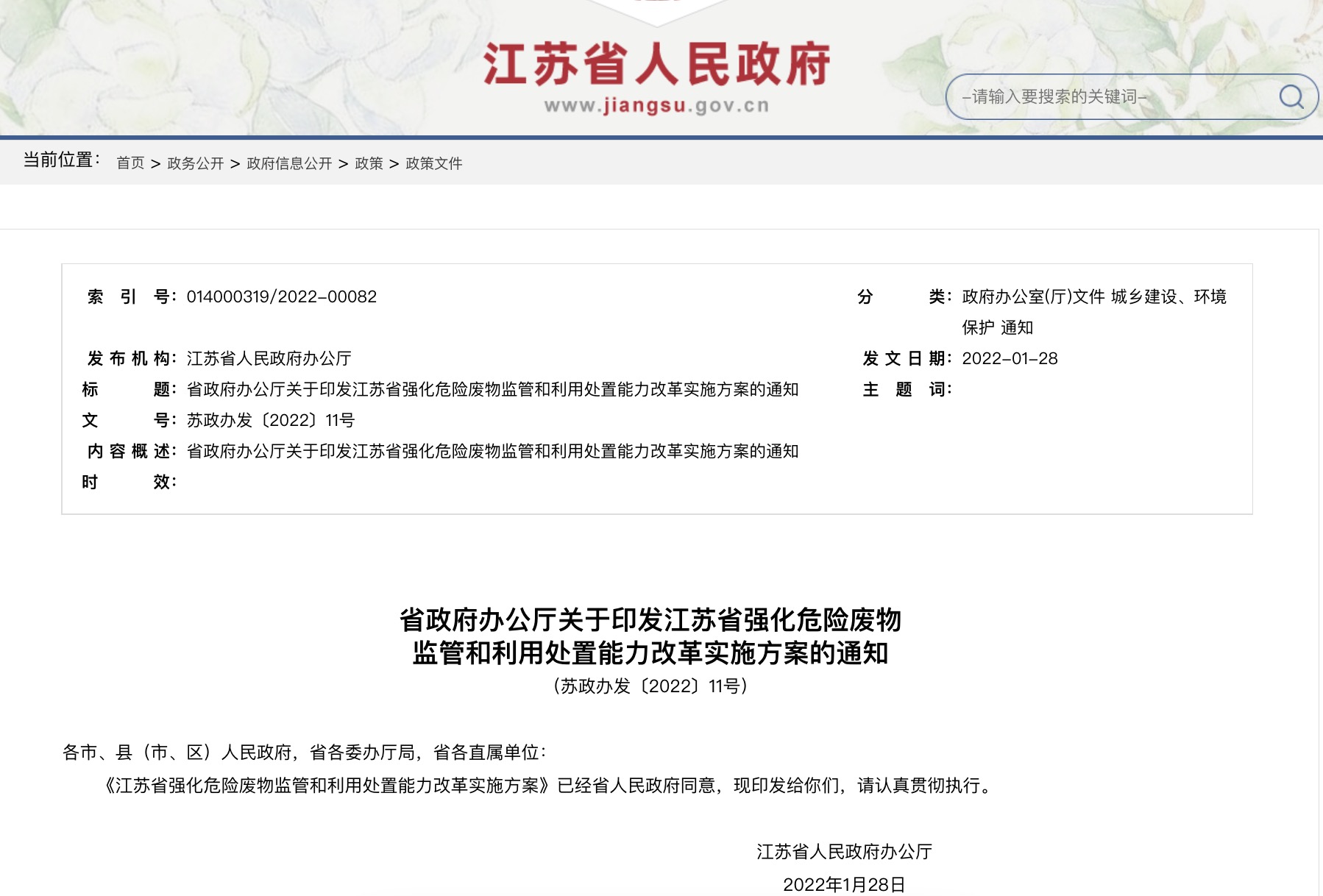 省政府辦公廳關(guān)于印發(fā)江蘇省強化危險廢物監管和利用處置能力改革實(shí)施方案的通知(蘇政辦發(fā)〔2022〕11號)各市、縣(市、區)人民政府,省各委辦廳局,省各直屬單位:...