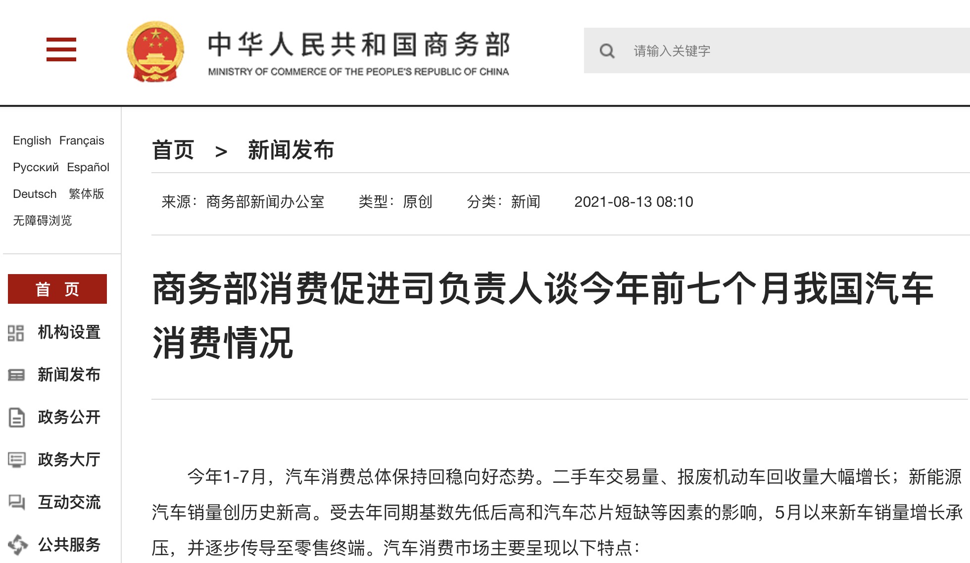 今年1-7月,汽車(chē)消費總體保持回穩向好態(tài)勢。二手車(chē)交易量、報廢機動(dòng)車(chē)回收量大幅增長(cháng);新能源汽車(chē)銷(xiāo)量創(chuàng )歷史新高。受去年同期基數先低后高和汽車(chē)芯片短缺等因素的影響,...