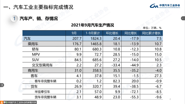 1-9月,汽車(chē)生產(chǎn)1824.3萬(wàn)輛,同比增長(cháng)7.5%,增速比1-8月繼續回落。
