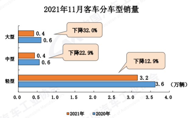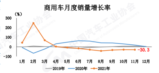 1-11月,商用車(chē)產(chǎn)銷(xiāo)分別完成429.3萬(wàn)輛和442.9萬(wàn)輛,同比分別下降9.1%和5.3%,降幅比1-10月均擴大2.8個(gè)百分點(diǎn)。其中,客車(chē)增幅回落,貨車(chē)降幅擴大。與2019年同期相比,商用車(chē)產(chǎn)銷(xiāo)同比增長(cháng)11.1%和14.2%,增幅比1-10月分別回落3.7和3.6個(gè)百分點(diǎn)。