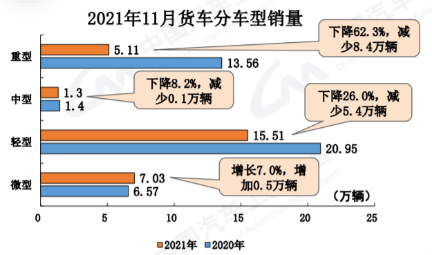 11月,商用車(chē)產(chǎn)銷(xiāo)分別完成35.3萬(wàn)輛和33.0萬(wàn)輛,環(huán)比分別增長(cháng)3.2%和1.1%;同比分別下降31.9%和30.3%,降幅比10月分別擴大5和0.6個(gè)百分點(diǎn)。與2019年同期相比,商用車(chē)產(chǎn)銷(xiāo)同比下降18%和17.6%,降幅比10月分別擴大13.7和8.7個(gè)百分點(diǎn)。中汽協(xié)副秘書(shū)長(cháng)陳士華強調,受?chē)欧艠藴是袚Q、“藍牌輕卡”政策預期帶來(lái)的消費觀(guān)望、房地產(chǎn)開(kāi)發(fā)行業(yè)較冷以及前期政策紅利逐步減弱等因素影響,下半年商用車(chē)市場(chǎng)需求弱于上半年。