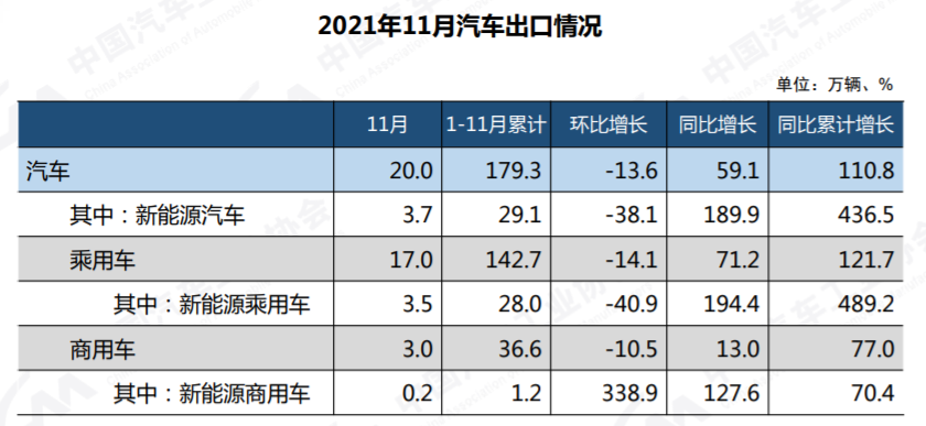 11月,汽車(chē)出口量雖然較上月有所下降,但仍達到20萬(wàn)輛,同比增長(cháng)了59.1%,我國的汽車(chē)出口市場(chǎng)仍處于上升區間。其中,新能源汽車(chē)本月的出口貢獻率達到了32.9%。1-11月,汽車(chē)企業(yè)出口179.3萬(wàn)輛,同比增長(cháng)1.1倍。中汽協(xié)副總工程師許海東表示,隨著(zhù)中國品牌乘用車(chē)海外戰略的不斷推進(jìn),中國品牌出口有望表現得越來(lái)越好。