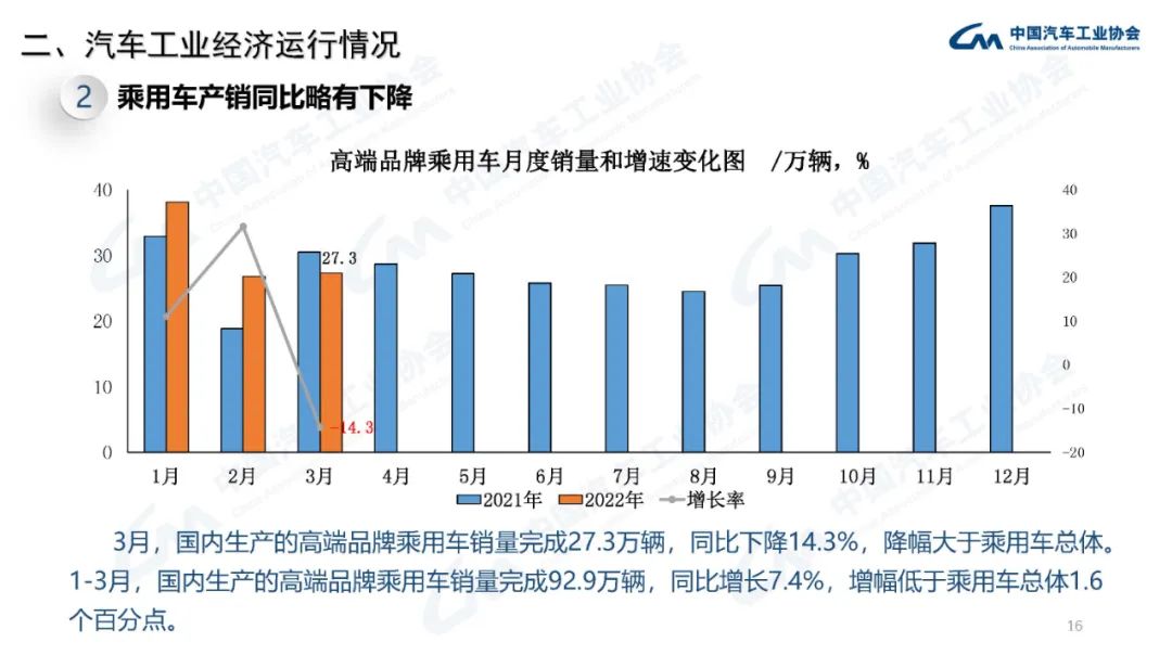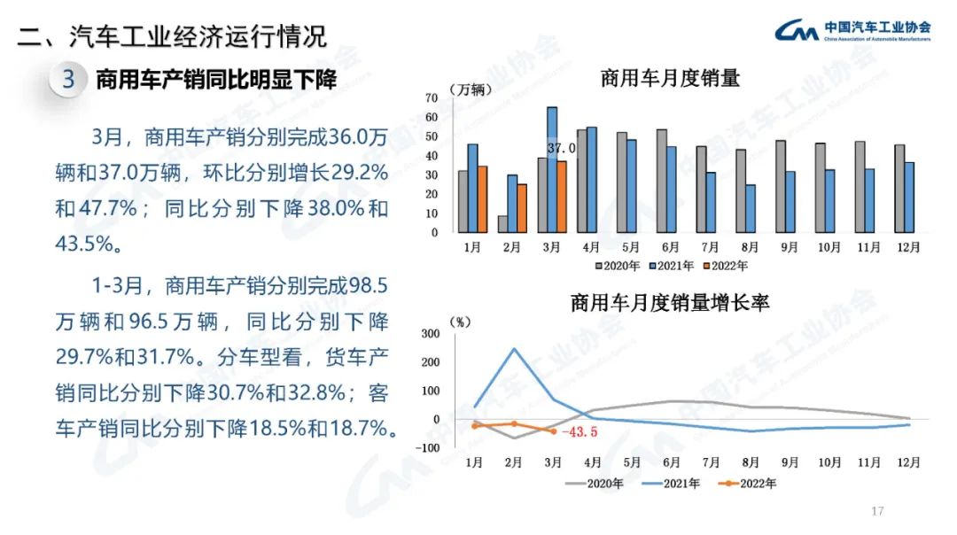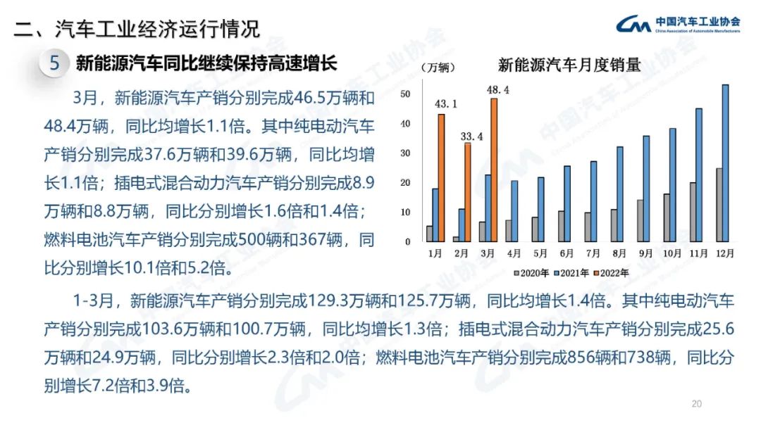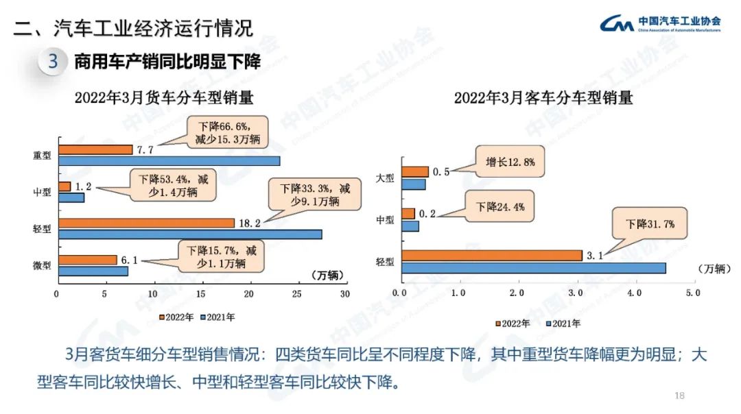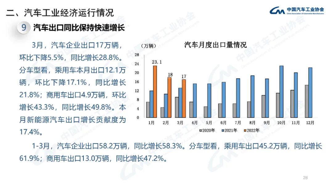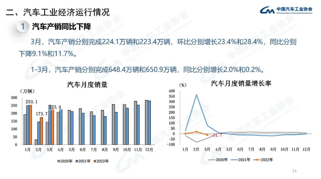 2022年3月,國內疫情近期多發(fā),市場(chǎng)主體困難明顯增加,經(jīng)濟循環(huán)暢通遇到一些制約,新的下行壓力進(jìn)一步加大。從汽車(chē)供給端看,芯片短缺的情況沒(méi)有得到明顯緩解,動(dòng)力電池原材料價(jià)格快速上漲,進(jìn)一步推高企業(yè)產(chǎn)品制造成本,汽車(chē)企業(yè)生產(chǎn)經(jīng)營(yíng)活動(dòng)受到一定影響,總體形勢不及預期;從汽車(chē)消費端看,消費動(dòng)能明顯不足,與同期相比,呈現一定幅度下降。