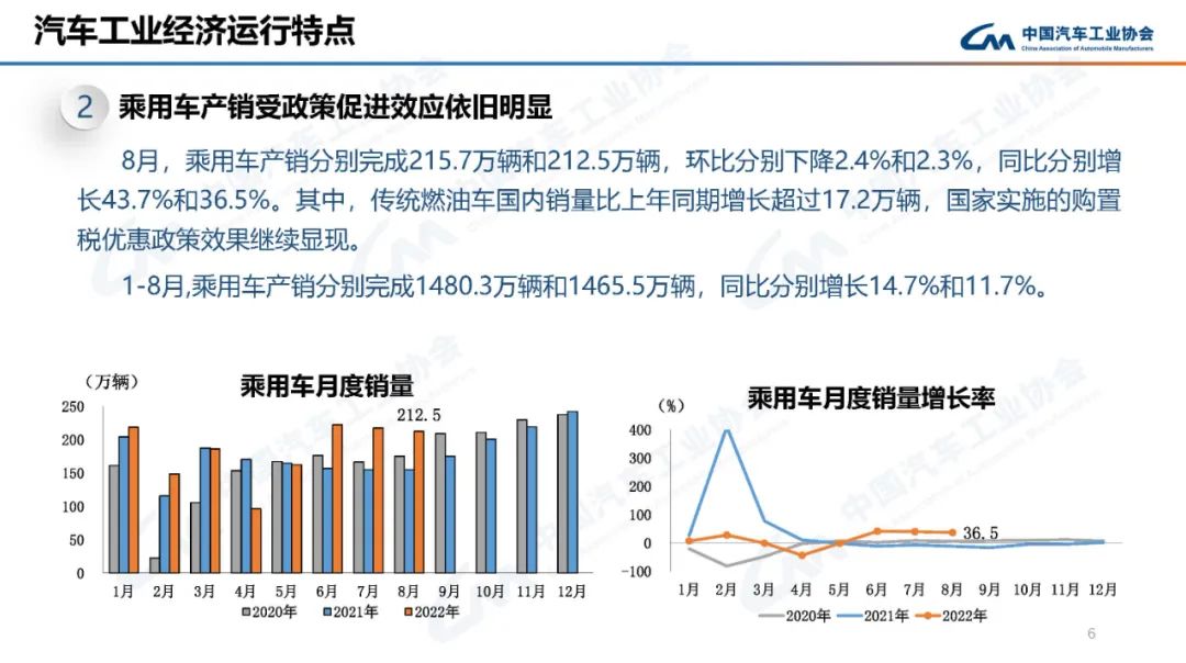 2022年8月,汽車(chē)產(chǎn)銷(xiāo)同比延續保持快速增長(cháng)勢頭,購置稅優(yōu)惠等促消費政策持續發(fā)力,乘用車(chē)消費企穩上升,即使經(jīng)濟運行有波動(dòng),消費依然堅韌,已逐步恢復到正常狀態(tài);商用車(chē)產(chǎn)銷(xiāo)實(shí)現今年以來(lái)首次同比增長(cháng);本月新能源汽車(chē)產(chǎn)銷(xiāo)、汽車(chē)出口同比均創(chuàng )歷史新高。